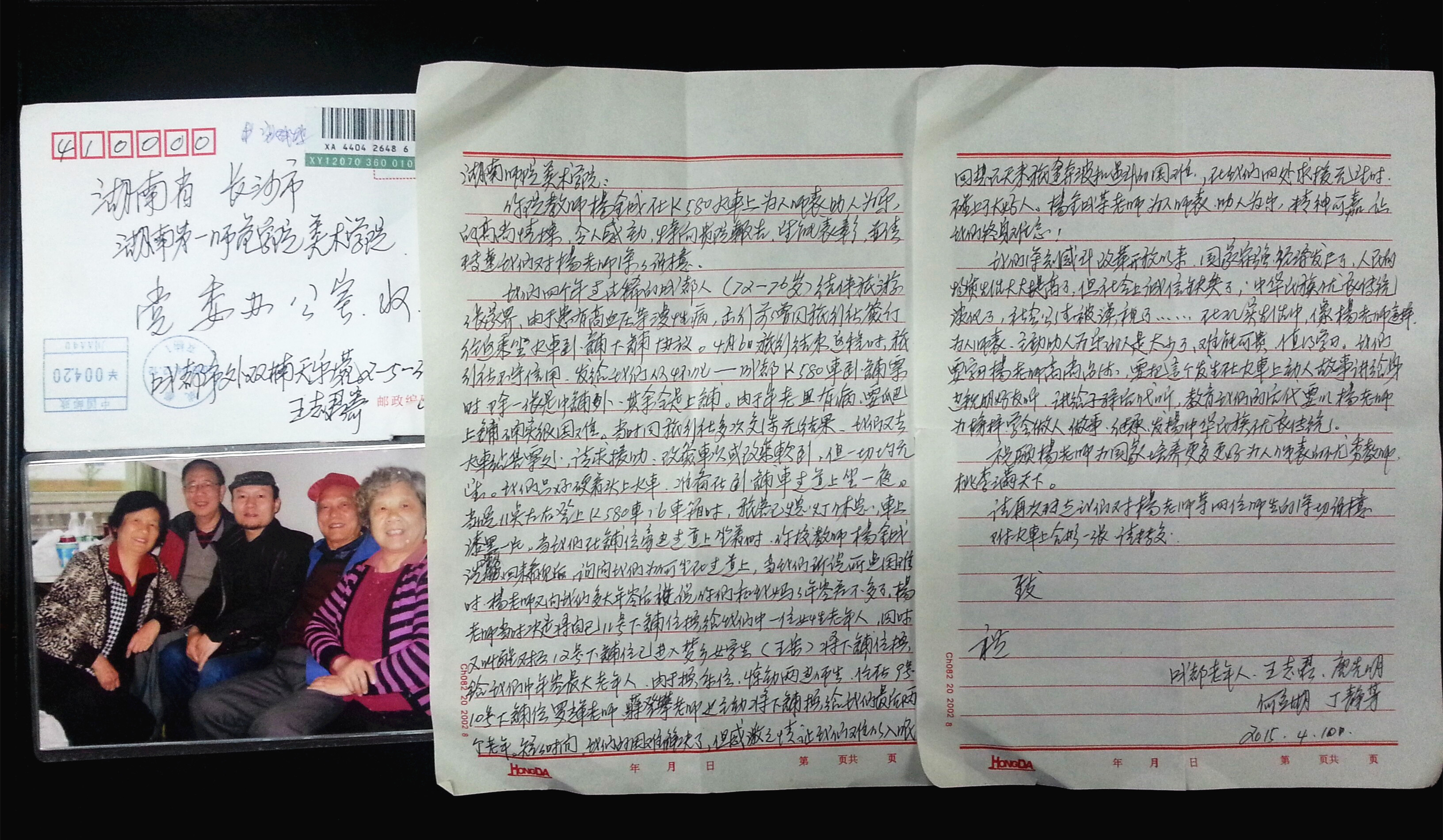 老人們?cè)谛胖懈袊@:“我們深感在現(xiàn)實(shí)生活中,像楊老師這樣為人師表,主動(dòng)助人為樂(lè)的人難能可貴,值得學(xué)習(xí)。”臨分別時(shí),四位老人特地要與楊金成老師合影留念。