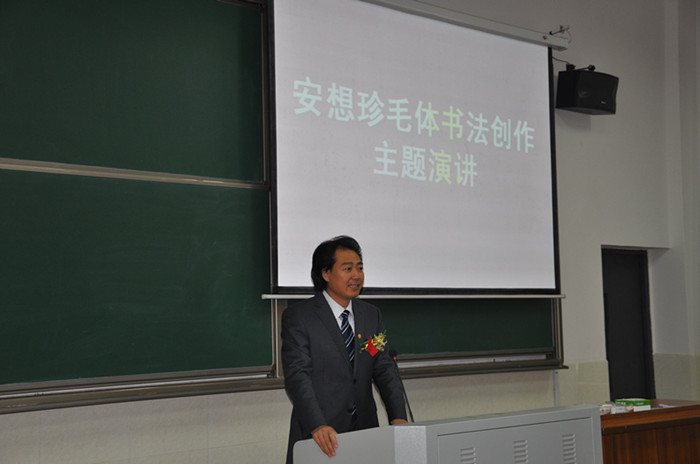 儀式結(jié)束后,安先生為我校師生發(fā)表了“安想珍毛體書法創(chuàng)作”學(xué)術(shù)演講。安先生詳細(xì)介紹了自己從事毛體書法創(chuàng)作以來的心得體會(huì),并從古文字的意義內(nèi)涵、毛澤東詩詞的意境、毛澤東書法藝術(shù)風(fēng)骨等方面介紹了毛體書法創(chuàng)作的技巧與要領(lǐng)。最后,安先生勉勵(lì)在場師生說,只要我們有鍥而不舍的愚公移山精神、有敢為人先的湖湘精神、有奮斗不止的龍馬精神,我們的藝術(shù)成就就一定會(huì)越來越高。