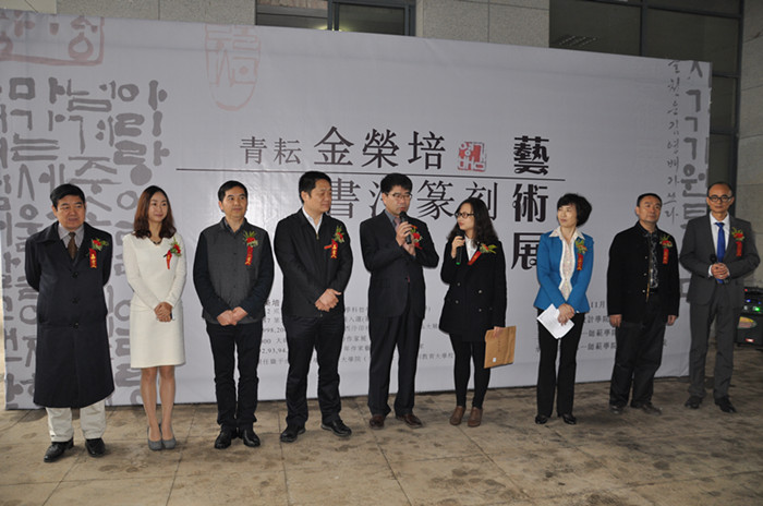 儀式上,副校長童小嬌發(fā)表了熱情洋溢的致辭。童小嬌首先代表學(xué)校對金先生的到來表示熱烈的歡迎和誠摯的謝意,并對金榮培先生和這次書藝展作了簡要介紹。金榮培是韓國著名書法家篆刻家,成均館大學(xué)博士畢業(yè),任韓國篆刻學(xué)會事務(wù)局長,西泠印社名譽(yù)社員,大韓民國美術(shù)大展審查委員,富川書藝文人畫協(xié)會會長。童小嬌感謝金先生對我校書法專業(yè)的發(fā)展提供了有力的支持和幫助,希望師生們充分利用好這一平臺。金先生作為友誼的橋梁,不但將推進(jìn)我校書法專業(yè)的發(fā)展,更將給我校對外文化交流和合作帶來良好的契機(jī)。