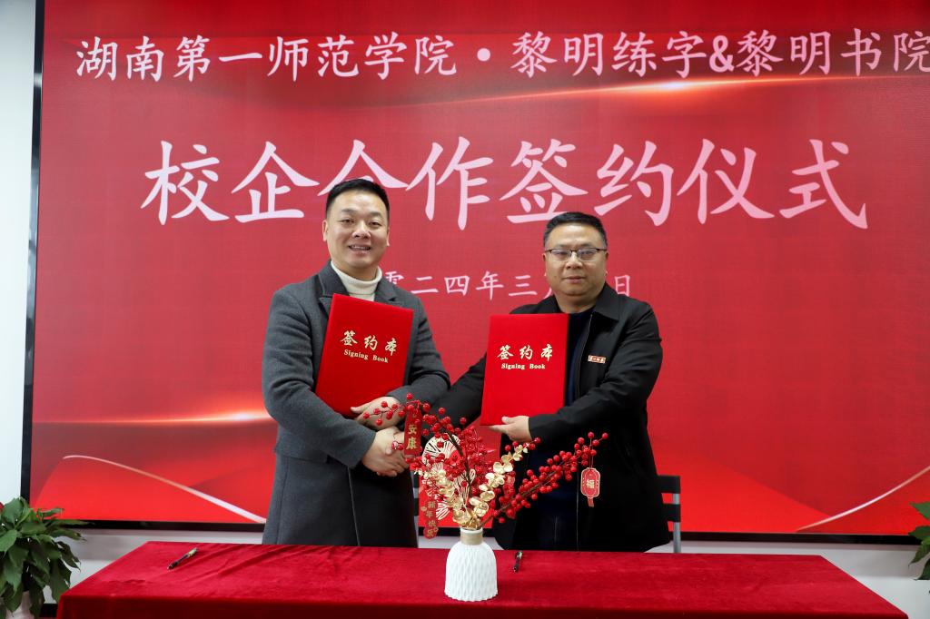 隨后,在與會人員的見證下,趙奇釗與趙黎明代表校企雙方簽訂了校企戰(zhàn)略合作協(xié)議,我校授予黎明練字&黎明書院“湖南第一師范學(xué)院實習(xí)實訓(xùn)基地”“湖南第一師范學(xué)院就業(yè)基地”牌匾。