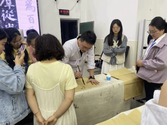 同日,湖南第一師范學院書法學系副主任王振凱老師帶來《楷書臨摹、創(chuàng)作及教學》的專題講座,他以“楷書之美,育人之道”為主線,從顏真卿《多寶塔碑》、歐陽詢《九成宮醴泉銘》等經(jīng)典碑帖臨摹切入,通過“讀帖—析筆—摹寫—創(chuàng)作”四步教學法,引導教師體悟楷書的結(jié)構韻律與精神內(nèi)涵。