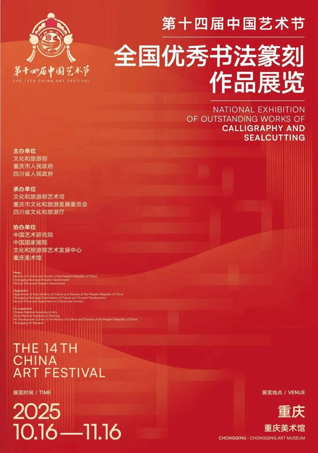 10月16日,由文化和旅游部、重慶市人民政府、四川省人民政府等單位聯(lián)合舉辦的第十四屆中國(guó)藝術(shù)節(jié)全國(guó)優(yōu)秀美術(shù)、書(shū)法篆刻、攝影作品展覽開(kāi)幕式在四川美術(shù)學(xué)院舉行。我院書(shū)法學(xué)系鐘全昌、馮高兩位教師作品入選本次展覽。充分體現(xiàn)了我院教師創(chuàng)作能力與藝術(shù)水平。