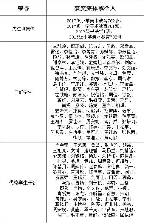 根據(jù)學(xué)校《關(guān)于評定2017—2018學(xué)年度先進(jìn)班集體、三好學(xué)生、優(yōu)秀學(xué)生干部的通知》的相關(guān)文件精神,本著“公平、公正、公開”和優(yōu)中選優(yōu)的原則,經(jīng)各班推薦,院學(xué)工辦審核,院評審委員會嚴(yán)格評審,最后擬推薦以下班集體為校級先進(jìn)班集體,以下學(xué)生為三好學(xué)生、優(yōu)秀學(xué)生干部: