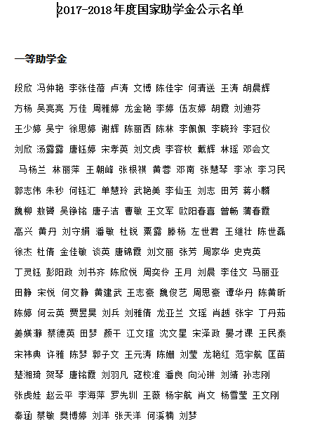 根據(jù)學(xué)校2017-2018獎(jiǎng)助學(xué)金評(píng)選的相關(guān)文件精神,本著“公開、公正、公平”的原則,經(jīng)各班申報(bào)、民主評(píng)議,院學(xué)工辦審核,院獎(jiǎng)助學(xué)金評(píng)定委員會(huì)最后嚴(yán)格評(píng)審,以下同學(xué)為我院2017-2018年度國家助學(xué)金擬上報(bào)人選。特此公示,公示期間2018年10月15日—20日,公示期間接受實(shí)名來電來訪,過期不予受理。受理辦公室:美術(shù)樓215,211,223.受理電話:88235431 88235429