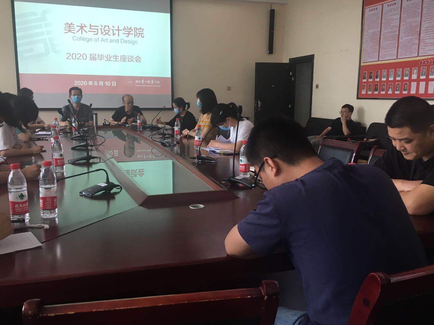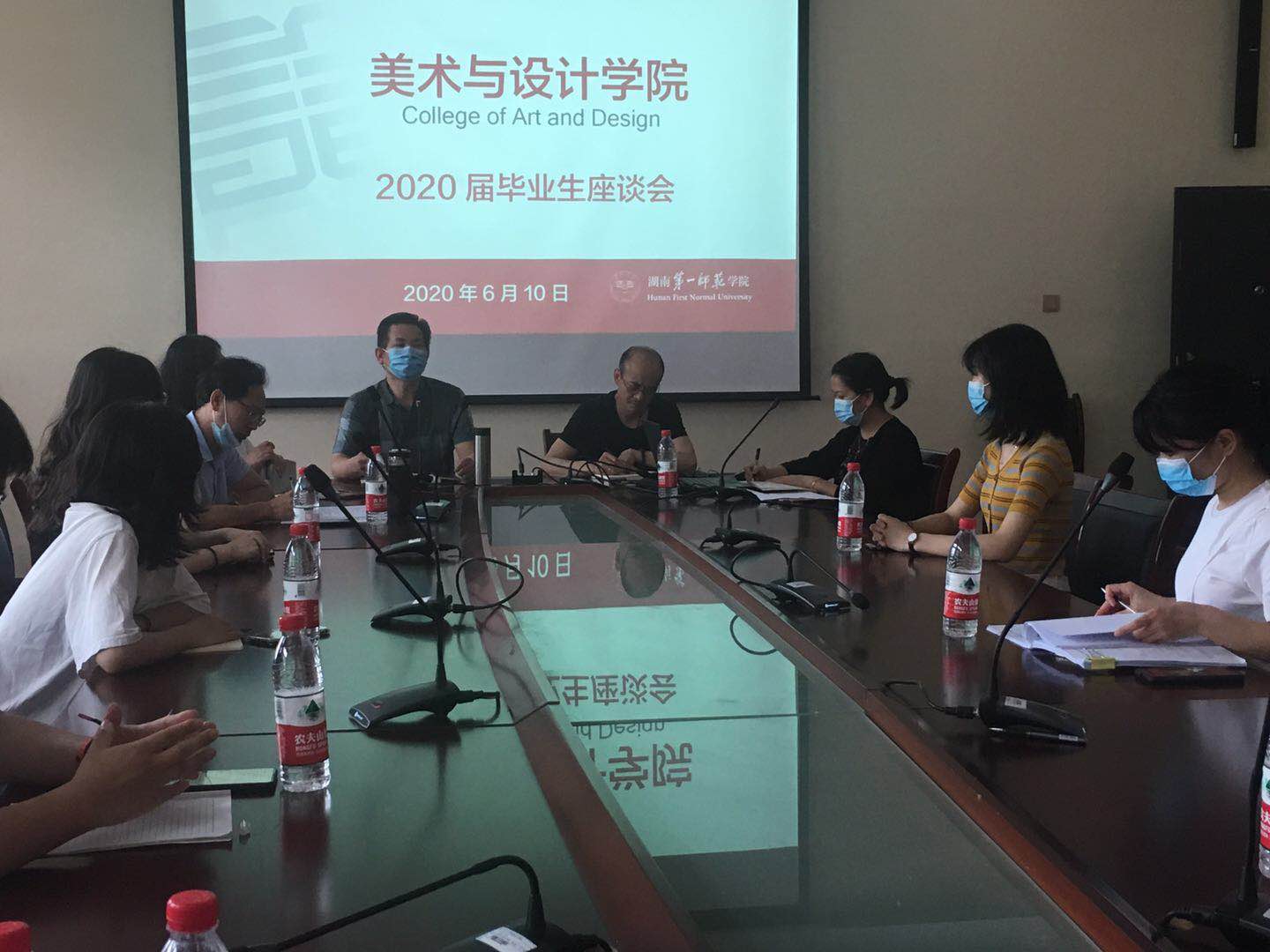 2020年6月10日上午9點半,美術與設計學院2020屆畢業(yè)生座談會于鶴鳴樓南棟201會議室舉行。美術與設計學院黨政領導范迎春、李華、舒克斌、蔡惠萌、張嫻,學工辦武湘梅老師和全體畢業(yè)班輔導員老師、27名畢業(yè)生代表參與了此次座談會。本次座談會由武湘梅老師主持。