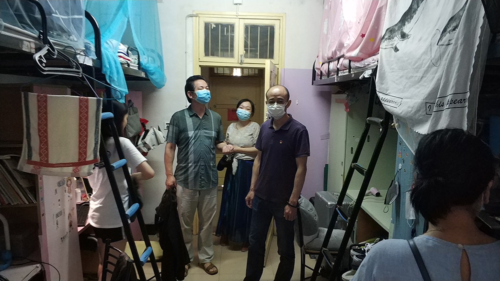 美術(shù)與設(shè)計學(xué)院領(lǐng)導(dǎo)下寢與畢業(yè)生面對面交流 發(fā)布時間:2020-06-03 作者:齊澤湘 瀏覽次數(shù): 6月2日,美術(shù)與設(shè)計學(xué)院范迎春書記、李華院長、武湘梅主任帶領(lǐng)輔導(dǎo)員下寢看望畢業(yè)生,親切地與畢業(yè)生進行交流,詳細了解同學(xué)們的畢業(yè)去向和離校準(zhǔn)備情況,并叮囑他們注意安全防護。