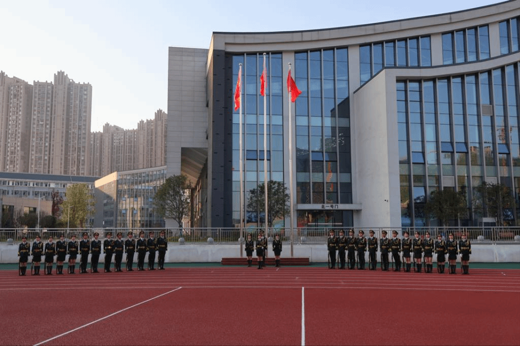 校國旗護(hù)衛(wèi)隊邁著整齊劃一、鏗鏘有力的步伐,護(hù)送五星紅旗入場,伴隨著莊嚴(yán)的國歌聲,鮮艷的五星紅旗緩緩升起,全體師生肅立致敬,晨光中五星紅旗迎風(fēng)飄揚(yáng)。