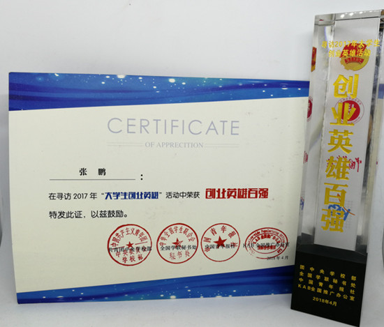 我校2017屆畢業(yè)生張鵬入選2017年全國大學(xué)生創(chuàng)業(yè)英雄100強