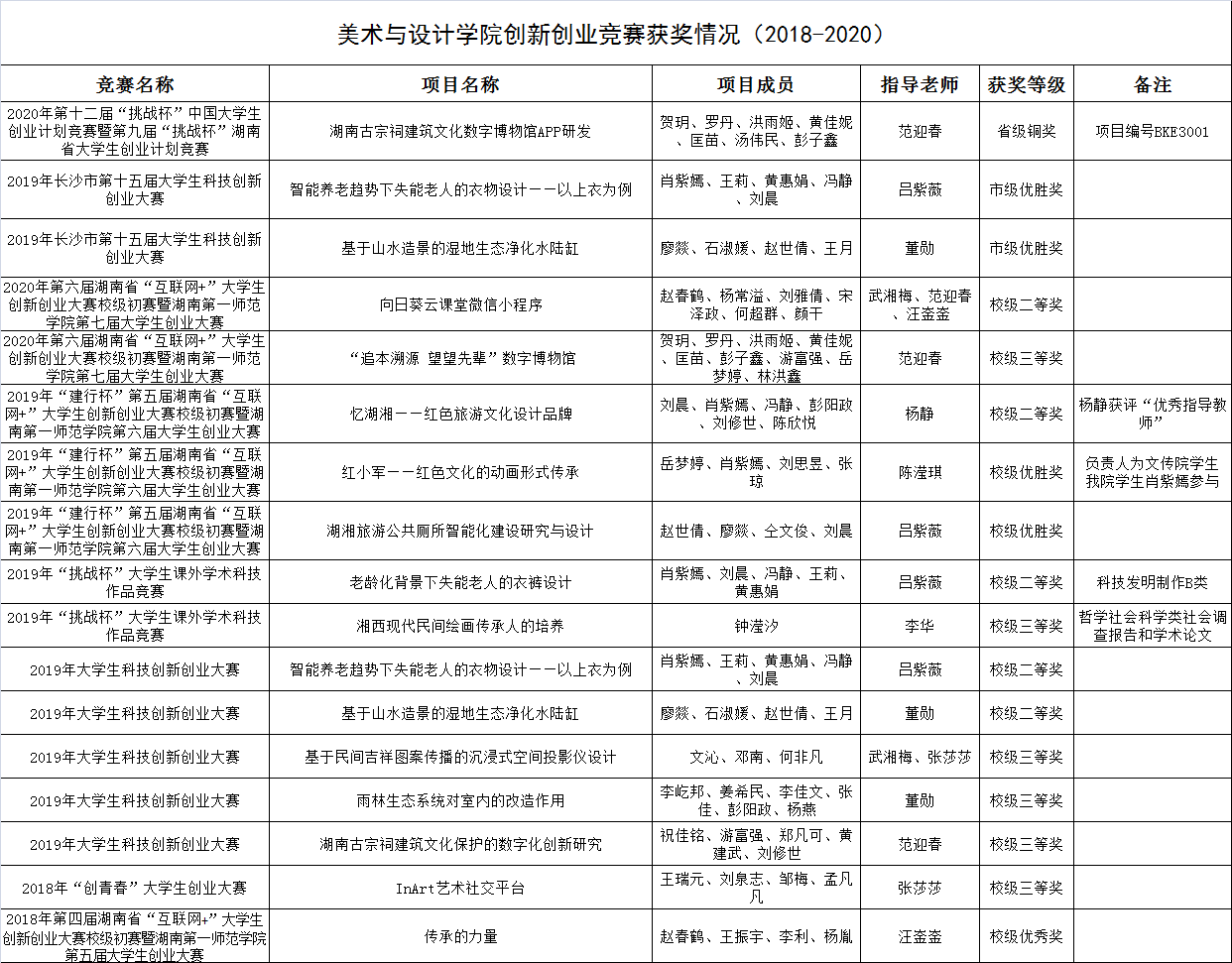 美術(shù)與設(shè)計(jì)學(xué)院創(chuàng)新創(chuàng)業(yè)競賽獲獎(jiǎng)情況(2018-2020) 發(fā)布時(shí)間:2020-11-11 作者: 瀏覽次數(shù):
