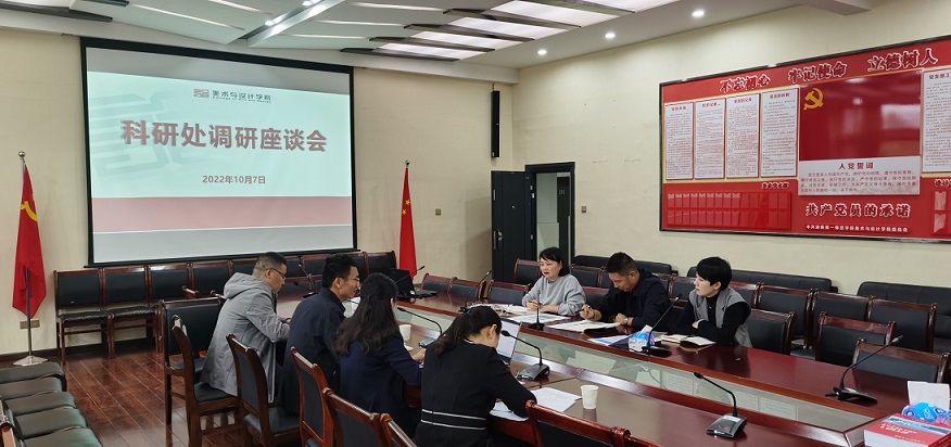 10月7日下午,科研處處長肖攀、副處長姜明芳、田祖?zhèn)サ热藖淼矫佬g(shù)與設(shè)計學(xué)院就科研工作和今年的核心指標(biāo)完成情況進(jìn)行了調(diào)研座談,院領(lǐng)導(dǎo)班子楊虎智副書記、蔡惠萌副院長、戴建宇副書記參加了本次座談會。