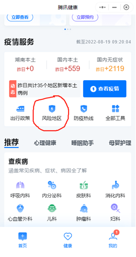 手機打開GPS位置服務(wù),微信搜索小程序“騰訊健康”,第一頁往下翻一點找到“風險地區(qū)”,點開后就可以看到當前區(qū)域的風險級別,下面就可以看到全國所有的低、中、高風險區(qū)。